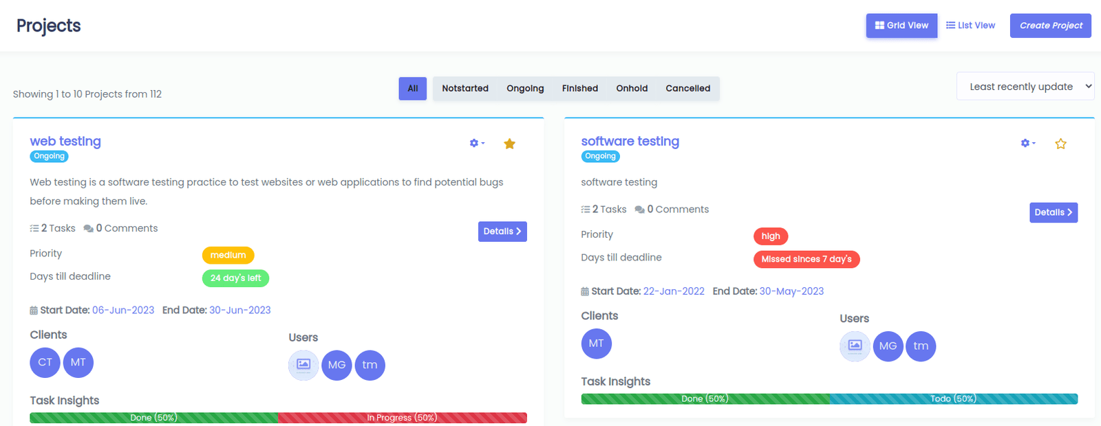 It provides basic information about task also you can filter tasks by project, status, due date, clients and users. you can see detailed information of particular task by clicking view button.